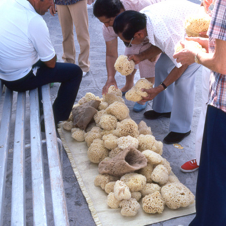 スポンジとして重宝されてきました。専門の職人ダイバーが水深30−40mまで潜り、